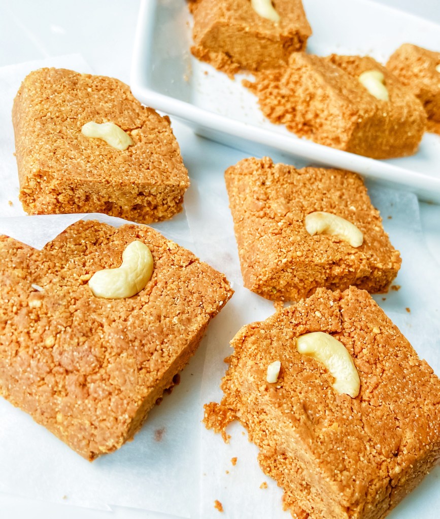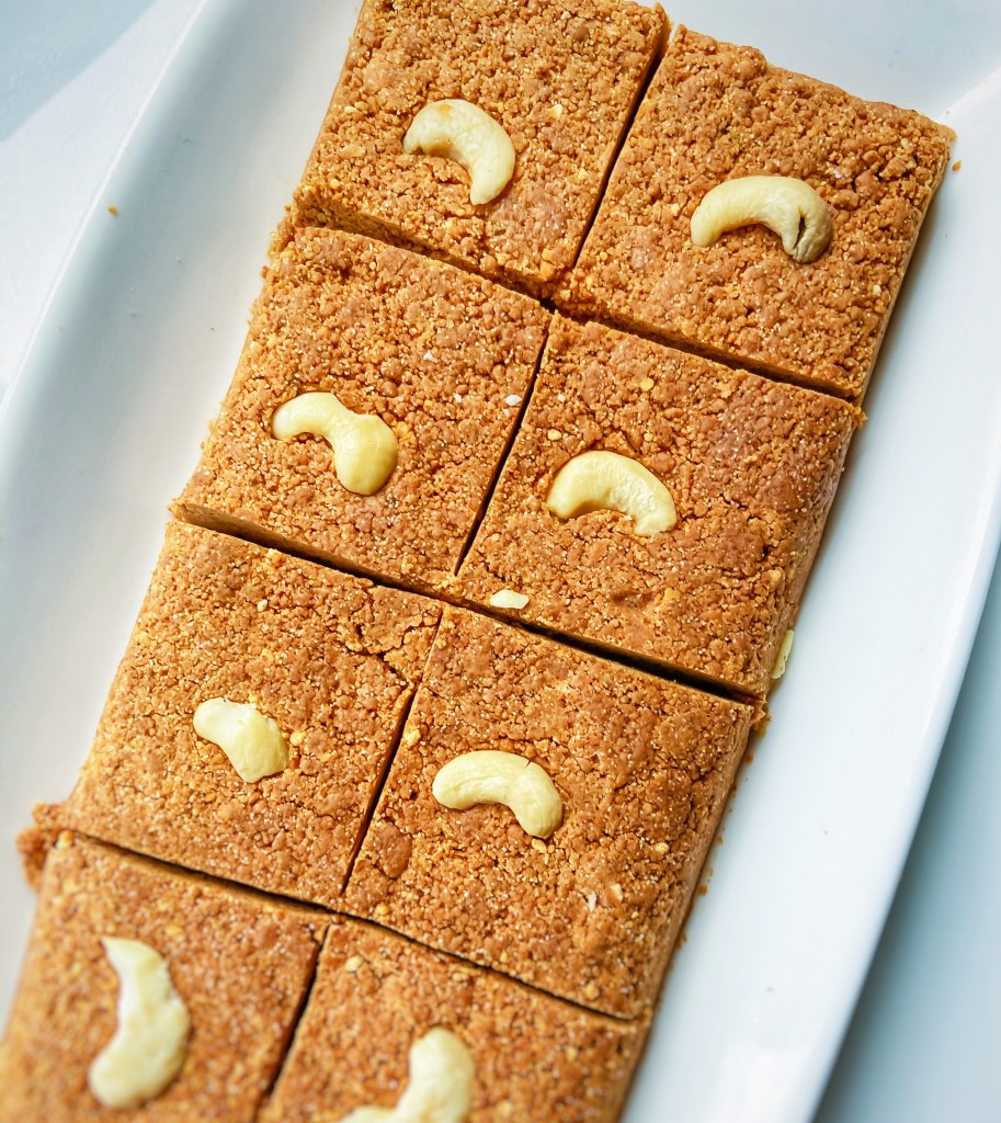 A healthier version of the traditional sweet made with gram (chickpea) flour and semolina with almond butter and hint of cardamom, a mellow but delicious sweet treat especially in festive season.
