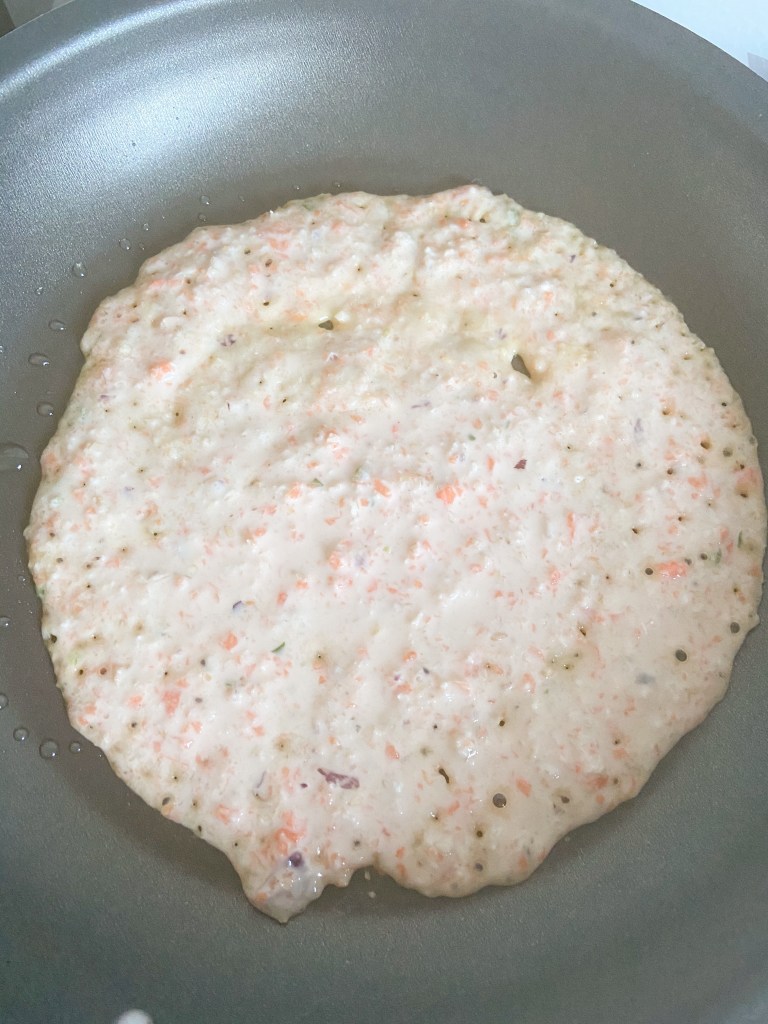 - Heat a pan add little oil, spread the oats mix on medium heat, cook on one side for 5-7 mins the top will have some bubbles and will be dryish , then flip and cook for another 3-4 mins