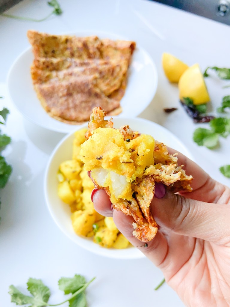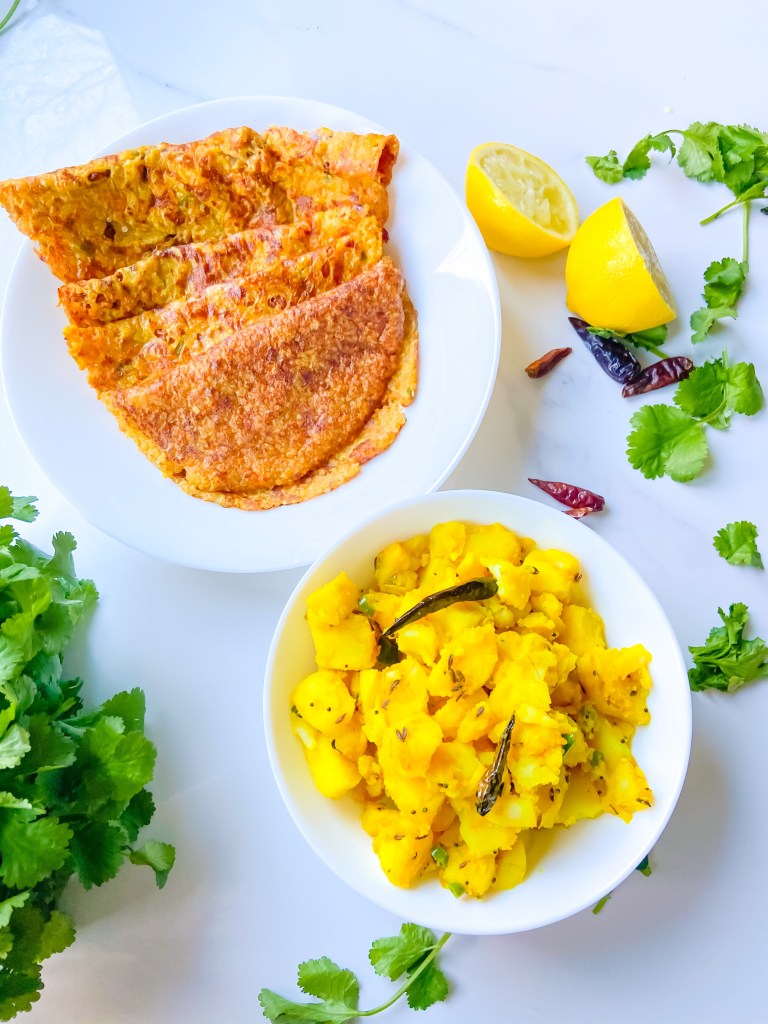 - For potatoes, heat some oil in a pan, add mustard seeds and red chilli when it starts to splatter add cumin cook for about 30 secs add turmeric, salt, green chillis and chopped boiled potatoes, mix well cook for about 5 mins on low heat. Add juice of half a lemon and cooked or another 2 mins